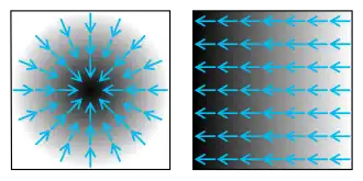 (Aici gradientul este scris ca vector linie, dar adesea este considerat a fi vector coloană; de notat că atunci când o funcție are o componentă temporală, gradientul adesea se referă doar la vectorul derivatelor sale spațiale.)