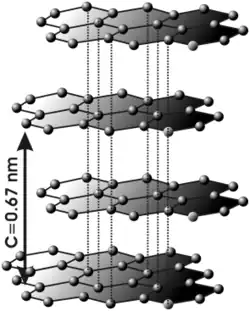 În grafitul cristalin există o structură de straturi paralele (straturi bazale); aceste straturi au legături covalente hexagonale între atomi (o legătură stabilă), în schimb două straturi alăturate sunt legate între ele prin legături ionice (legături labile). Această modificare de legături prin schimbarea de direcție determină anizotropia grafitului, ce atrage după sine: