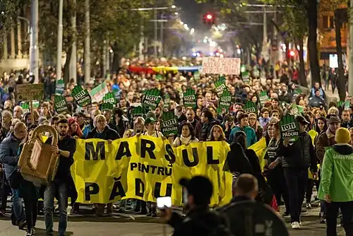 Pe 3 noiembrie 2019, mii de oameni au ieșit în stradă în zeci de orașe din România și Europa pentru a mărșălui împotriva dezastrului ecologic provocat de tăierile abuzive din pădurile României. Marșul pentru Păduri a fost inițiat de Greenpeace România și organizat împreună cu Declic și Agent Green. Protestul capătă atenția presei internaționale și ajunge chiar să fie distribuit pe Instagram de Leonardo DiCaprio[66].