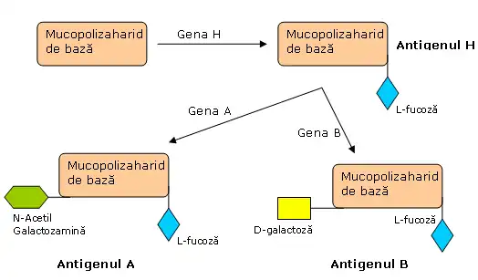 1. Un substrat mucopolizaharidic de bază este modificat, sub acțiunea unei gene H, prin adăugarea unei molecule de L-Fucoză, rezultând substanța H, sau antigenul H, comun pentru A și B. Este important de menționat faptul că substratul mucopolizaharidic are structură comună cu cea a unui antigen specific pneumococului. De fapt gena H codifică o glicoziltransferază, neapărat necesară pentru a sinteza atât A cât și B.