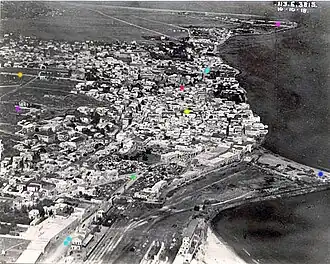 punctul roz - cartierul Bat Galim, creat pe peninsula Capul Carmelului. În imagine nu apare portul Haifa, deschis în anul 1933. În partea de dreapta jos a fotografiei se vede îmbarcaderul căii ferate a Hedjazului, se pot vedea vagoane de tren