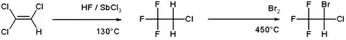 Pe scară industrială, halotanul se obține din combinarea tricloroetilenei cu HF în prezența tricloridului de atimon la o temperatura de 130 °C, apoi acesta reacționeză cu bromul la o temperatura de 450 °C.
