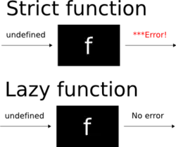 Haskell prezintă o evaluare leneșă a expresiilor, adică "apel prin nevoi"