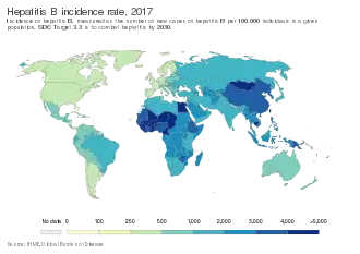Hepatita B este o boală de natură infecțioasă, agentul patogen fiind virusul hepatitei B (HBV).Virusul este de tip ADN (adenovirus), iar boala mai este cunoscută și sub denumirea de hepatită serică.[3] Boala a cauzat epidemii în părți ale Asiei și Africii și este endemică în China. Aproximativ un sfert din populația globului, mai mult de 2 miliarde de persoane, au fost infectate cu virusul hepatitei B. Acest număr include 350 milioane de purtători cronici ai virusului. Transmiterea hepatitei B se face prin expunerea la sânge sau secreții infectate, cum ar fi sperma sau secrețiile vaginale. Hepatita B nu se poate transmite prin contact zilnic cum ar fi strângerea de mână, folosirea acelorași tacâmuri sau pahare, sărut, îmbrățișare, tușit sau strănut. Boala acută cauzeză inflamarea ficatului, voma, urină de culoarea cafenie închisă, diaree, icter și mai rar, decesul. Hepatita B cronică poate eventual cauza ciroză și cancer la ficat, care are o rată mică de răspuns chimoterapiei. Prevenirea infecției se face prin vaccinare. Deși replicarea virusului se face în ficat, virusul se răspândește în sânge, unde proteinele specifice virusului și anticorpii specifici se detectează la persoanele bolnave. Aceste proteine și anticorpi sunt căutați în testele de sânge pentru a diagnostica infecția. [4]