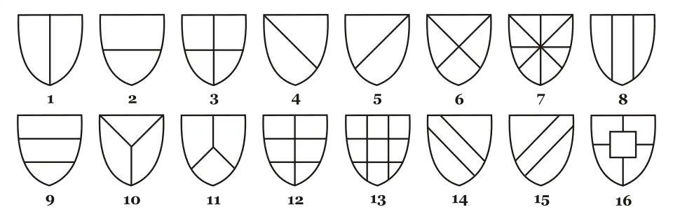 1 — scut despicat; 2 — scut tăiat; 3 — scut sfertuit (scartelat); 4 — scut tăiat în bandă; 5 — scut tăiat în bară; 6 — scut tăiat în curmeziș (încrucișat,decusat, în Crucea Sfântului Andrei); 7 — scut gironat; 8 — scut tripartit în pal; 9 — scut tripartit în fascie (în brâuri); 10 — scut tăiat în furcă; 11 — scut tăiat în furcă răsturnată; 12 — scut împărțit în șase părți; 13 — scut împărțit în nouă părți; 14 — scut tăiat în trei; 15 — scut împărțit în trei; 16 — scut peste tot (în inimă).