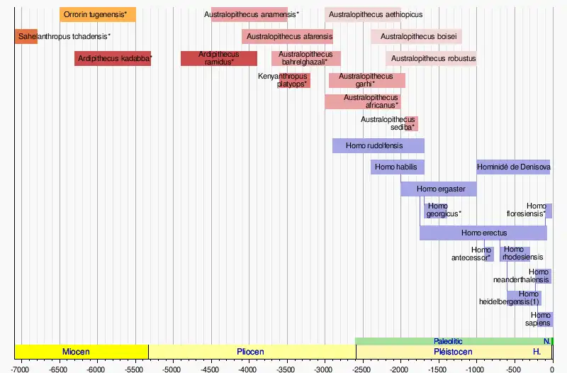 ,______________________________________ Ardipithecus ramidus + __| |______________________________________ Australopithecus anamensis + | |,________________________________ Australopithecus afarensis + | | | |__________________________ Australopithecus garhi + | | | |__________________________ Australopithecus sediba + | | | |__________________________ Australopithecus africanus + | | | | ,____________________ Paranthropus aethiopicus + | |___| | | __________________ Paranthropus robustus + | |___| | |__________________ Paranthropus boisei + | |,_____________________________ Kenyanthropus platyops + | |______________________ Homo gautengensis + | |,_____________________ Homo habilis + | |__________________ Homo georgicus + | |__________________ Homo floresiensis + | |__________________ Homo rudolfensis ++ | |,____________ Homo ergaster + | |,________ Homo erectus + | | | |_____ Omul de Denisova + (încă nedescrisă) | |_________ Homo antecessor + | |,________ Homo heidelbergensis + | | | |_____ Homo neanderthalensis + | |,________ Homo rhodesiensis + | |_____ Homo sapiens | |__ Homo sapiens idaltu