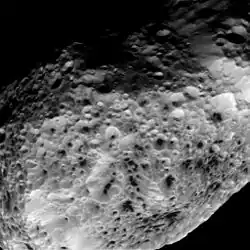 ![]() Hyperion în culoare aproximativ naturală, așa cum a fost fotografiat de sonda spațială Cassini | |