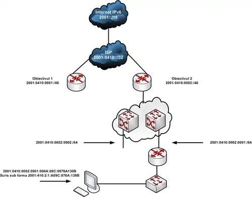 O adresă IPv6 are 128 de biți, reprezentați ca 8 grupuri de 4 cifre hexazecimale separate prin două puncte (:)