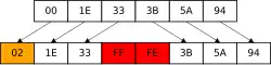 - se transformă adresa MAC (numită și EUI-48) într-un identificator EUI-64 adăugând secvența 0xFFFE între primii 3 și ultimii 3 octeți din adresă (metoda descrisă în imaginea din dreapta)