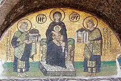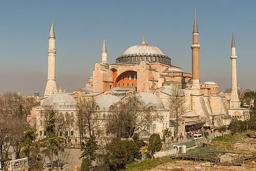 Constantinopolul avea mai multe edificii religioase că bisericile Sfintei Irina, Biserica Sfânta Sofia, Biserica Sfinții Apostoli. Biserica Sfânta Sofia a fost construită în 532 și inaugurată pe 25 decembrie 537.