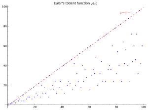 φ(n) pentru 1 ≤ n ≤ 143 + 0 1 2 3 4 5 6 7 8 9 10 11 0 N/A 1 1 2 2 4 2 6 4 6 4 10 12 4 12 6 8 8 16 6 18 8 12 10 22 24 8 20 12 18 12 28 8 30 16 20 16 24 36 12 36 18 24 16 40 12 42 20 24 22 46 48 16 42 20 32 24 52 18 40 24 36 28 58 60 16 60 30 36 32 48 20 66 32 44 24 70 72 24 72 36 40 36 60 24 78 32 54 40 82 84 24 64 42 56 40 88 24 72 44 60 46 72 96 32 96 42 60 40 100 32 102 48 48 52 106 108 36 108 40 72 48 112 36 88 56 72 58 96 120 32 110 60 80 60 100 36 126 64 84 48 130 132 40 108 66 72 64 136 44 138 48 92 70 120
