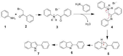 - Reacția dintre αbrom acetofenonona cu 2 molecule de anilină pentru a forma intermediarul 4.