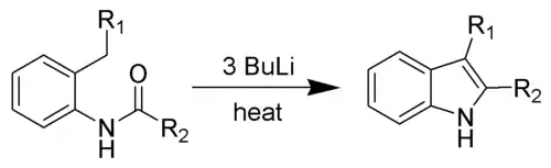 Condensarea o-iodanilinei cu o alchină disubstitută, are loc într-un exces de alchină, în prezența fie a carbonatului de potasiu fie a acetatului de potasiu, în amestec egal cu clorură de litiu. Metoda are avantajul că permite grefarea a numeroase grupări funcționale atît pe nucleul anilinei cît și la nivelul alchinei. Stereochimic, gruparea R cea mai voluminoasă ocupă în final poziția 2 (R2).