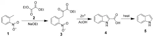 - Condensarea o-nitrotoluenului 1 cu dietiloxalatul 2 pentru a forma etil-onitrofenilpurivatul 3.