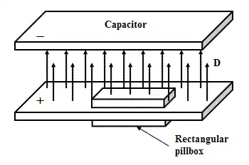 Pe părțile laterale ale cutiei, dA este perpendicular pe câmp, deci integrala pe această secțiune este zero, la fel ca integrala pe fața care se află în afara condensatorului unde D este zero. Singura suprafață care contribuie la integrală este, prin urmare, suprafața cutiei din interiorul condensatorului și, prin urmareunde A este aria suprafeței feței superioare a cutiei și este densitatea de sarcină liberă de suprafață pe placa pozitivă. Dacă spațiul dintre plăcile condensatorului este umplut cu un dielectric izotrop liniar omogen cu permitivitate , atunci există o polarizare indusă în mediu, și astfel diferența de tensiune dintre plăci esteunde d este distanța între ele.