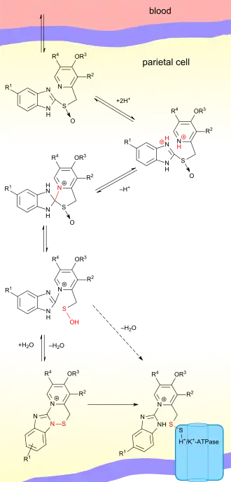 Compușii ca atare sunt promedicamente care necesită activare. Așadar, ei se absorb în circulația sistemică, iar apoi se secretă în canaliculele secretoare din celulele parietale. În mediul acid de la acest nivel compușii sunt activați la un intermediar reactiv de tip sulfenamidă, și se leagă ireversibil de resturile de cisteină prin legături covalente disulfidice.[13] Pentru o se relua secreția acidă, este necesară sinteza de noi pompe de protoni, iar până atunci secreția acidă va fi scăzută.