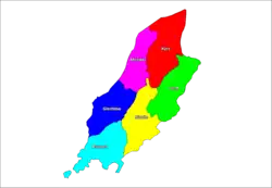 Insula este divizată în șase districte administrative, numite sheading. Termenul se presupune că este de origine nordică și ar însemna divizie de corabie, fiecare district se presupune că era responsabil de producerea unui anumit număr de corăbii de război. Cele șase districte sunt: