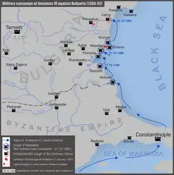 Între timp, bulgarii și bizantinii s-au mai luptat odată în 1364. În 1366, când împăratul Ioan V Paleologul se întorcea dintr-i călătorie în vest, bulgarii au refuzat să-l lase să treacă prin Bulgaria. Această atitudine a avut efecte nefaste, întrucât un alt aliat bizantin, contele Amadeus al VI-lea de Savoia, a răspuns prin a captura mai multe porturi maritime bulgărești, inclusiv Ankhialos (Pomorie) și Mesembria (Nesebǎr), deși nu a reușit să cucerească Varna. Depășit, Ioan Alexandru a fost obligat să facă pace.[30]