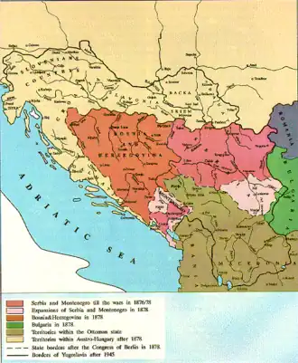 În aceste condiții în anul 1875 izbucnește răscoala populației creștine din provincie. Serbia și Muntenegru (două entități statale distincte în acel moment) au declarat război în 1876 Imperiului otoman ca răspuns la reprimarea răscoalei însă au fost învinse. Cu toate acestea, Congresul de la Berlin din 1878 a decis ca administrarea provinciilor Bosnia și Herțegovina să fie preluată de către Austro-Ungaria. În mod formal, aceasta nu era o anexare, teritoriul continua să facă parte din Imperiul otoman, moneda otomană ar fi urmat să fie utilizată pe teritoriul Bosniei iar sultanul să fie recunoscut drept suveran.