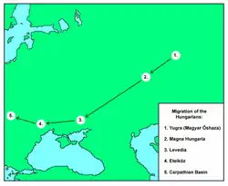 Urmele cele mai depărtate ale triburilor maghiare ne duc în epoca străveche, în mileniile dintre anii 10000 și 4000 î.Hr., în țara de baștină din zona munților Urali. În jurul anului 4000 î.Hr. această comunitate uraliană se dezmembrează, iar grupurile etnice fino-ugrice desprinse din ea se vor stabili la vest de Urali, la nord și la sud de confluența râurilor Volga și Kama. În mileniul al III-lea și al II-lea ungurii își continuă modul de viață preponderent de culegători, bazat pe o economie naturală. În preajma anului 1500 î.Hr. în modul de viață al fino-ugricilor a avut loc o schimbare fundamentală: trecerea la o economie productivă bazată pe agricultură și creșterea animalelor. În această perioadă are loc dezmembrarea unității fino-ugrice și formarea unei limbi de fond ugrice. În jurul anului 1000 î.Hr. se dezmembrează și unitatea ugrică, drept care începând cu această perioadă putem vorbi de habitatul predecesorilor propriu-ziși ai ungurilor, pe care cercetătorii l-au plasat de-a lungul cursului mijlociu al Volgăi Magna Hungaria. Protomaghiarii aici au intrat în contact cu iranienii din stepă, în special cu alanii, după cum o dovedesc câteva împrumuturi lexicale. Apoi, s-au aflat vreme îndelungată în relații cu triburi turanice. Maghiarilor li s-au alăturat onogurii, de unde și numele de unguri sub care acest popor a fost cunoscut de lumea creștină. De la alți turanici, vecini ai ciuvașilor, maghiarii au împrumutat foarte multe cuvinte, mai ales aproape ceea ce privește agricultura și creșterea vitelor, precum și multe din antroponime. Mai multe triburi maghiare din epoca cuceririi sunt desemnate prin nume turanice. Totuși, tipul fizic al ungurilor nu pare să se fi modificat în urma vreunui metisaj, căci a rămas mereu europoid prin excelență.[1] În această regiună stepică s-au grupat triburile maghiare între secolele XII-II-lea î.Hr. Aici au adoptat un stil de viață din ce în ce mai nomad/migrator care a contribuit la coeziunea acestui popor format din triburi amestecate. Către secolul al VII-lea sau al VIII-lea, maghiarii au părăsit regiunea și în jurul anului 750 ajung în Levedia aflată între Don și Marea Azov. Acesta-i locul unde duc legende și firul tradiției populare maghiare cu privire la descălecat: legenda lui Hunor și Magor. Peste câteva decenii triburile maghiare migrează mai departe către apus, în secolul IX maghiarii se găsesc între Nipru și Nistru, în ținutul numit Etelköz (Teritoriul dintre râuri). Aici cele șapte triburi maghiare și cele trei triburi cabarice (turcice) care li s-au atașat își aleg conducători comuni. Sub comanda conducătorului principal (kende) Levéd și a secundului său (gyula) Álmos pătura militară conducătoare a ungurilor, în urma diferitelor alianțe militare temporare, se angajează uneori în campanii militare (sau ca mercenari) duse la mare distanță. Tot de aici maghiarii întreprindeau și raiduri de pradă. Încă din 837 ungurii au răspuns unei cereri a bulgarilor și au intervenit în regiunea Dunării, pentru a-i opri pe deportații din Adrianopol să se întoarcă în orașul lor de baștină din regiunea nord-dunăreană în care au fost așezați.
