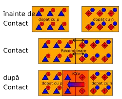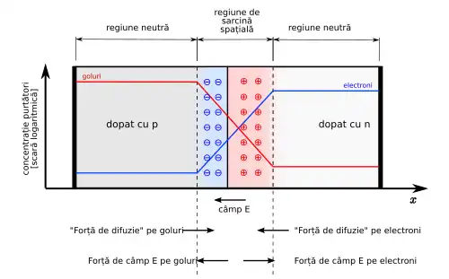 - o parte din electronii liberi ai regiunii n (aflați în zona de vecinătate), difuzează în regiunea p, unde se recombină cu golurile.