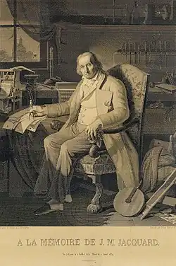Fiul unui lucrător în industria textilă ("meșter-fabricant"), el a profesat diverse meserii, dintre care unele în strânsă legătură cu producerea mătăsurilor, dar și cu arta imprimeriei. Studiind de unul singur mecanica, reușește în 1801 să pună la punct războiul de țesut Jacquard care îi poartă numele. Dezvoltând o idee anterioară a lui Jacques de Vaucanson, Jacquard își dotează războiul de țesut cu un ingenios mecanism care selecta diferențiat firele de urzeală după un „program” înscris pe plăcuțe perforate (inventatorul cartelelor perforate fiind Basile Bouchon). Prin această inovație, războiul de țesut devine mult mai simplu de operat, reducându-se numărul de lucrători la unul singur, față de condițiile anterioare, când era necesar efortul conjugat al mai multor operatori umani.