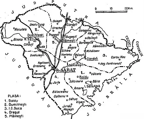 5. Plasa Orașul (în partea de sud, cu reședința la Râmnicu Sărat).