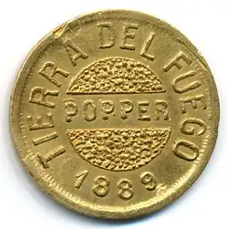 Într-o scrisoare din iulie 1892 trimisă lui Don Bartolomé Mitre y Vedia, fiul generalului Mitre, Popper afirma: „[...]Am bătut aceste monede de aur datorită lipsei de posibilități de comunicație regulată între Țara de Foc și capitala Republicii, a deselor fluctuații ale cursului monetar [...] cât și din necesitatea de evita inconvenientele care provin din manevrarea prafului și pepitelor din acest metal”[19]. Aceste medalii aveau puterea circulatorie limitată la Țara de Foc. Câteva matrițe ale monedelor provenite fie, în exploatarea minieră din Țara de Foc, fie la monetăria din Buenos Aires sunt păstrate la „Museo del Fin del Mundo” din Ushuaia, Țara de Foc și la „Muzeul numismatic al Băncii Naționale” (în spaniolă Museo Numismático del Banco de la Nación) din Buenos Aires.
