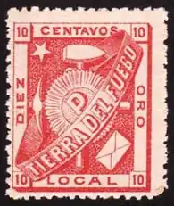 „Timbrul”, de culoarea roșu carmin, reprezenta simbolul activității de minerit, ciocanul și târnăcopul, peste care este desenat un soare care are în centru litera „P” (Popper); acest ansamblu de imagini este înconjurat de o bandă cu titlul „TIERRA DEL FUEGO”. Ca supliment, în partea de stânga sus se află o stea cu cinci colțuri și în partea din dreapta jos o scrisoare. Timbrul poartă înscris pe el „DIEZ CENTAVOS ORO LOCAL” și cifra „10” în fiecare din cele patru colțuri.
