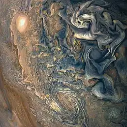 Vizualizare în culori îmbunătățite a furtunilor din sudul lui Jupiter
