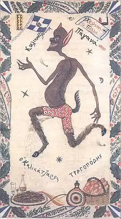 Reprezentare a unui kallikantzaros cu picioare de țap (tragopodis)