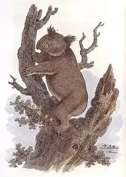 Prima imagine publicată a Koalei a apărut în lucrarea de istorie naturală a lui George Perry, Arcana (1810).[113] Perry l-a numit „Leneșul de Noua Olandă” deoarece îl considera similar cu adevărații leneși, genul Bradypus din America Centrală și de Sud. Disprețul său pentru koala, evident în descriere, era tipic atitudinii predominante a englezilor față de fauna Australiei, pe care o considerau ciudată și primitivă:[114]