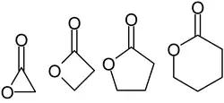 Nomenclatura lactonelor: α-acetolactonă, β-propiolactonă, γ-butirolactonă și δ-valerolactonă