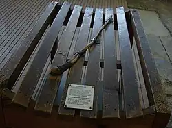 ![]() Soldați americani păzesc intrarea principală imediat după eliberare, 1945 | |