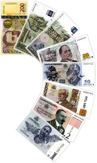 | Bancnote | 1, 2, 5, 10, 20, 50, 100, 200 și 500 de Lari | ||