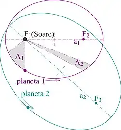 - Cele două sectoare umbrite A1 și A2 au aceeași arie și timpul pentru ca planeta 1 să acopere segmentul A1 este egal cu timpul de acoperire a segmentului A2.