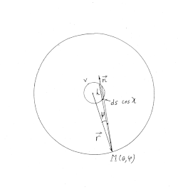unde, la fiecare θ,φ, suma se face intâi după volumele elementare în care v este împărțit de razele care pleacă din M și am presupus volumul v mic, astfel incât n ≈ -r/r și cos ψ ≈ 1(r este vectorul de poziție al lui M față de centrul sferei). În limita dsk→0, suma este chiar volumul v, așa încât: