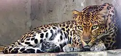 | Leopardul de Amur (P. p. orientalis) (Schlegel, 1857)[52][53] | Este originar din Orientul Îndepărtat al Rusiei și din nordul Chinei, dar este extinct local în peninsula coreeană.[2] | ![]() |
