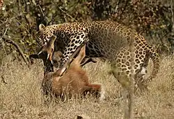 - ↑ Hayward, M.W.; Henschel, P.; O'Brien, J.; Hofmeyr, M.; Balme, G.; Kerley, G. I. H. (). „Prey preferences of the leopard (Panthera pardus)” (PDF). Journal of Zoology. 270 (4): 298–313. doi:10.1111/j.1469-7998.2006.00139.x. Arhivat din original (PDF) la . Accesat în .