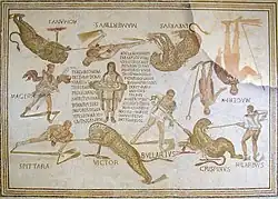 În mitologia greacă, era un simbol al zeului Dionysos, care era înfățișat purtând piele de leopard și folosind leoparzii ca mijloc de transport. Într-un mit, zeul a fost capturat de pirați, dar doi leoparzi l-au salvat.[160] Romanii au capturat leoparzi și i-au folosit ca animale de luptă pentru bătăliile din arene. În timpul jocurilor de 100 de zile cu ocazia deschiderii Colosseumului, aproximativ 9.000 de animale și-au pierdut viața în numele distracției, dintre care 410 erau leoparzi.[161] Măcelul în masă a leoparzilor a continuat mulți ani. Este cunoscut că în anul 169, de exemplu, un singur eveniment a cauzat moartea a 63 de leoparzi sălbatici. Aceste vânători nu au fost abolite până în secolul al VI-lea, când practic leoparzii nu mai trăiau în Africa de nord și Orientul mijlociu.[162] În timpul domniei împăratului Traian, un total de aproximativ 11.000 de animale au fost ucise.[163] Faptul că romanii bogați dețineau menajerii private a contribuit, de asemenea, la dispariția populațiilor locale. Împăratul Octavianus Augustus deținea 3.500 de animale, inclusiv 680 de lei și 600 de leoparzi și gheparzi, toate fiind ucise în timpul a 26 de festivități.[164][163] După dezintegrarea Romei, leoparzii au continuat să moară în arenele Imperiului Bizantin.[165]