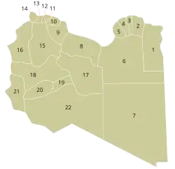 Libia a fost împărțită în trecut sub formă de guvernorate sau muhafazat, apoi se organizează teritoriul său în 25 de municipii sau baladiyat. Ulterior, țara a fost împărțită în 34 de sha'biyat. Apoi s-a restrâns la 22 de sha'biyat.