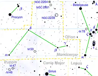 | Constelații învecinate | Câinele Mare Câinele Mic Gemenii Hidra Iepurele Orion Pupa |