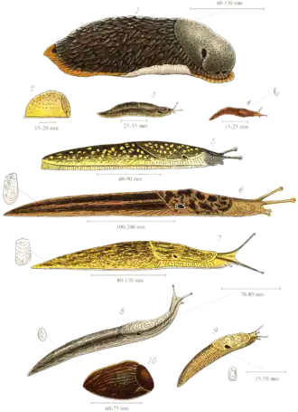 | Diverse specii de limacși: Arion ater, Kerry slug, Limax maximus și Limax flavus | |