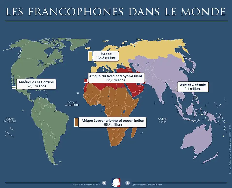 - ↑ Date prezentate la modul condițional de État des lieux du français dans le monde.