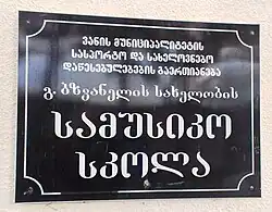 Un semn de la o școală de muzică în Mtavruli cu font sans-serif în partea de sus, Mkhedruli în font serif la mijloc și Mtavruli în font serif în partea de jos