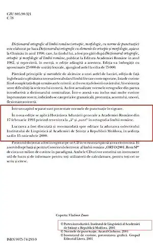 ru L.I. Luht, B.P. Narumov. (). „Limba română”. Limbile lumii (Языки мира). Volumul 9: Limbile romanice (Романские языки). Institutul de linvistică al Academiei Ruse de Științe. ISBN 587444016X. - ↑ Acozmei, Constantin, ed. (). 100 de ani de grafie românească. ISBN 978-606-94358-1-6.