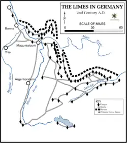 - precum și, din loc în loc, turnuri de pază și chiar garnizoane militare complete, bine organizate, numite castru ("castrum romanum"). Un castru roman reconstruit aproape în întregime, astăzi muzeu, se poate vizita la Saalburg în apropierea limesului de lângă orașul Bad Homburg din Germania.