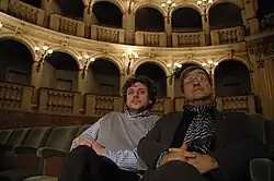 Lucio Dalla (D.) în Teatro Massimo, în Palermo, lângă producătorul de muzică Gianluigi Salvioni (S.)