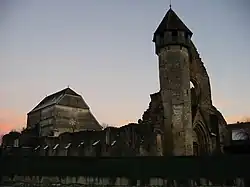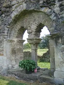 Zid cu poartă biforă în ruinele Abației Cisterciene