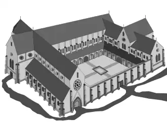 Construcția în piatră a mănăstirii a debutat ceva mai târziu, în anii '20 ai secolului al XIII-lea, cel mai târziu în jurul anului 1230. Edificarea mănăstirii s-a realizat în două faze principale de execuție, intercalate cronologic de marea invazie tătară din anul 1241. În prima fază de construcție, care etalează trăsături stilistice tributare romanicului târziu, s-a trasat planul general al mănăstirii, zidurile care delimitau curtea sa interioară fiind ridicate până la o înălțime de ca 3-4m deasupra nivelului contemporan de călcare. Din punct de vedere stilistic construcția arată înrudirea cu Mănăstirea Walkenried din Saxonia Inferioară și cu Mănăstirea Pannonhalma din Ungaria[2] (amândouă pe lista UNESCO a patrimoniului mondial).